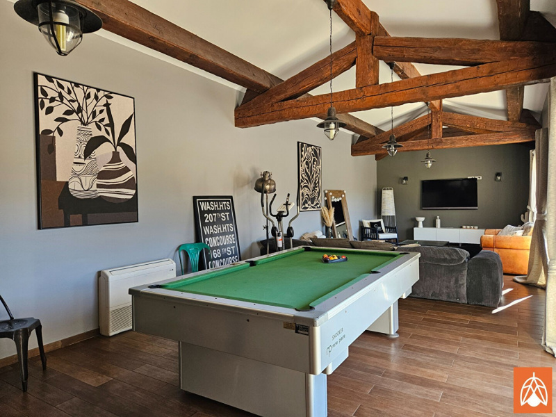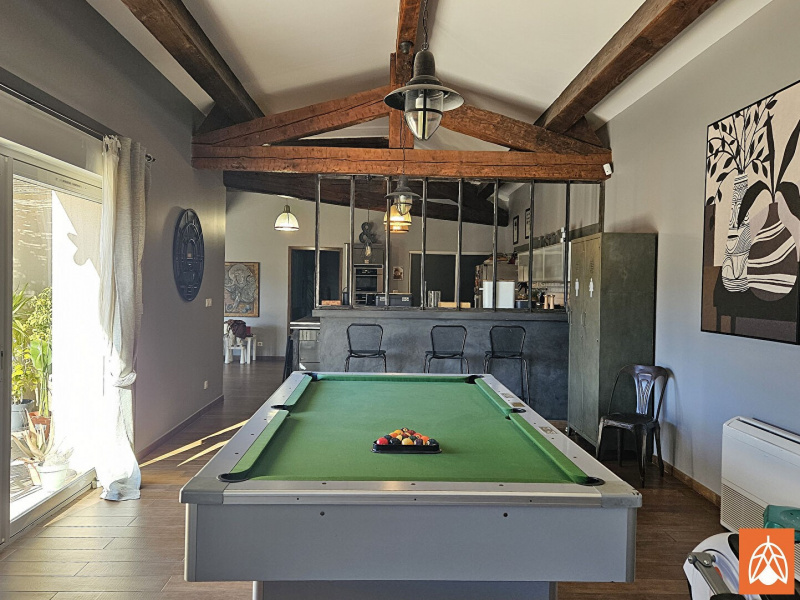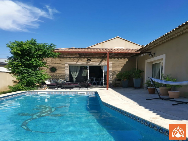 Les extérieurs sont agrémentés d'une terrasse en travertin exposée Sud - Sud Ouest et sa pergola, d'une belle piscine traditionnelle de 9.30 x 4.00 m en mosaïque et motif "Salamandre" , plages en tra